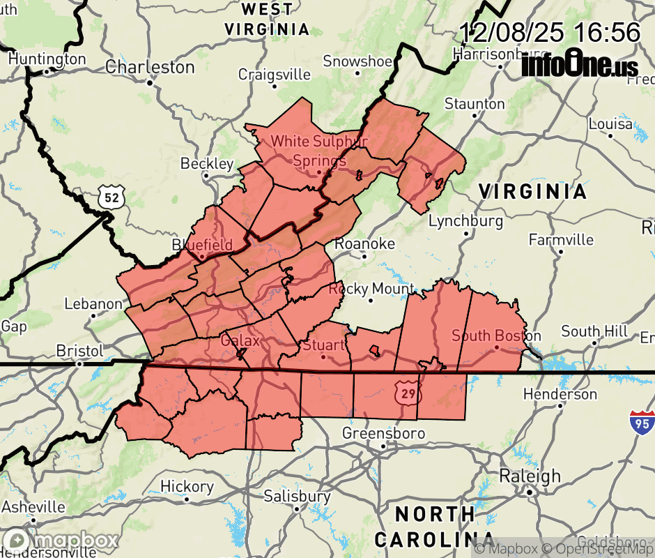 Canceled 12/8/25 9:34 PM Winter Weather Advisory issued December 8 at 4:55PM EST until December 9 at 1:00AM EST by NWS Blacksburg VA * WHAT... Snow. Additional snow accumulations up to one inch. * WHERE... Portions of north central and northwest North Carolina, south central, southwest, and west central Virginia, and southeast West Virginia. * WHEN... Until 1 AM EST Tuesday. * IMPACTS... Plan on slippery road conditions. The hazardous conditions could impact the Monday evening commute. ![]() |