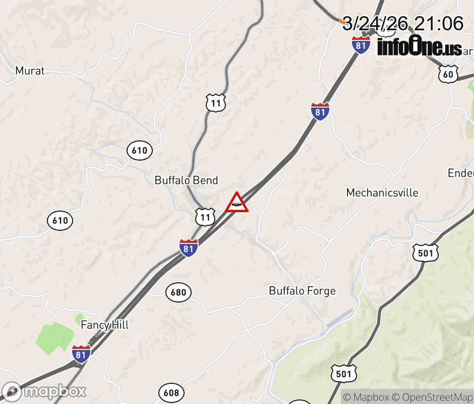 On I-81 South at mile marker 184.7 in the County of Rockbridge, motorists can expect delays due to a vehicle crash. Updated: Tue 3/24/26 9:06 PM EDT ![]() Updated: Tue 3/24/26 9:06 PM EDT |