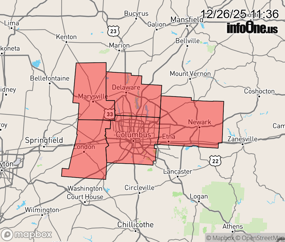 Canceled 12/26/25 12:52 PM Dense Fog Advisory issued December 26 at 11:35AM EST until December 26 at 1:00PM EST by NWS Wilmington OH * WHAT... Visibility one quarter mile or less in dense fog. * WHERE... Delaware, Franklin, Licking, Madison, and Union Counties. * WHEN... Until 1 PM EST this afternoon. * IMPACTS... Low visibility could make driving conditions hazardous. ![]() |