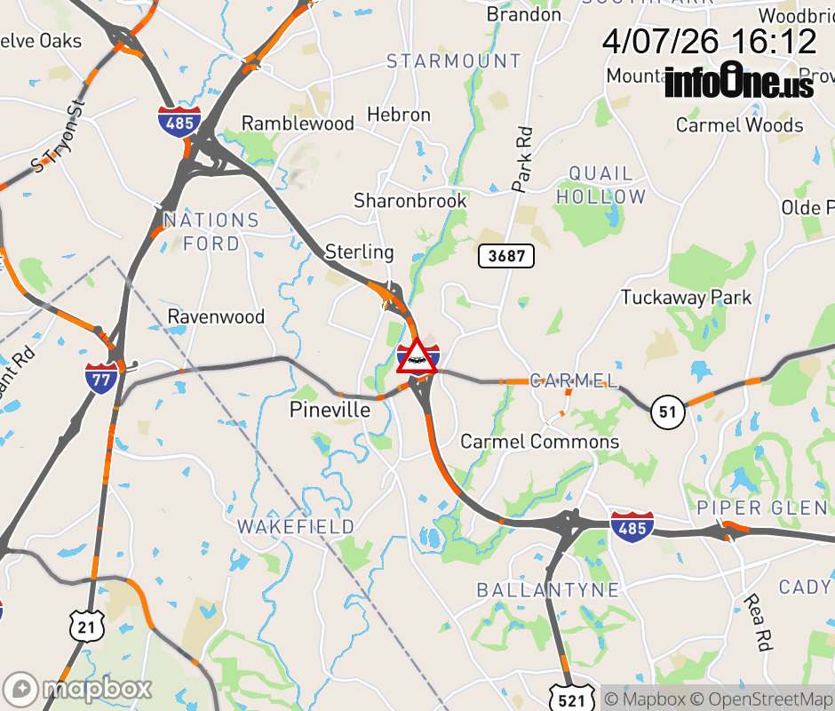The 2 left lanes are closed at Exit 64B (Pineville Mathews Road). Updated: Tue 4/7/26 4:12 PM EDT ![]() Updated: Tue 4/7/26 4:12 PM EDT |