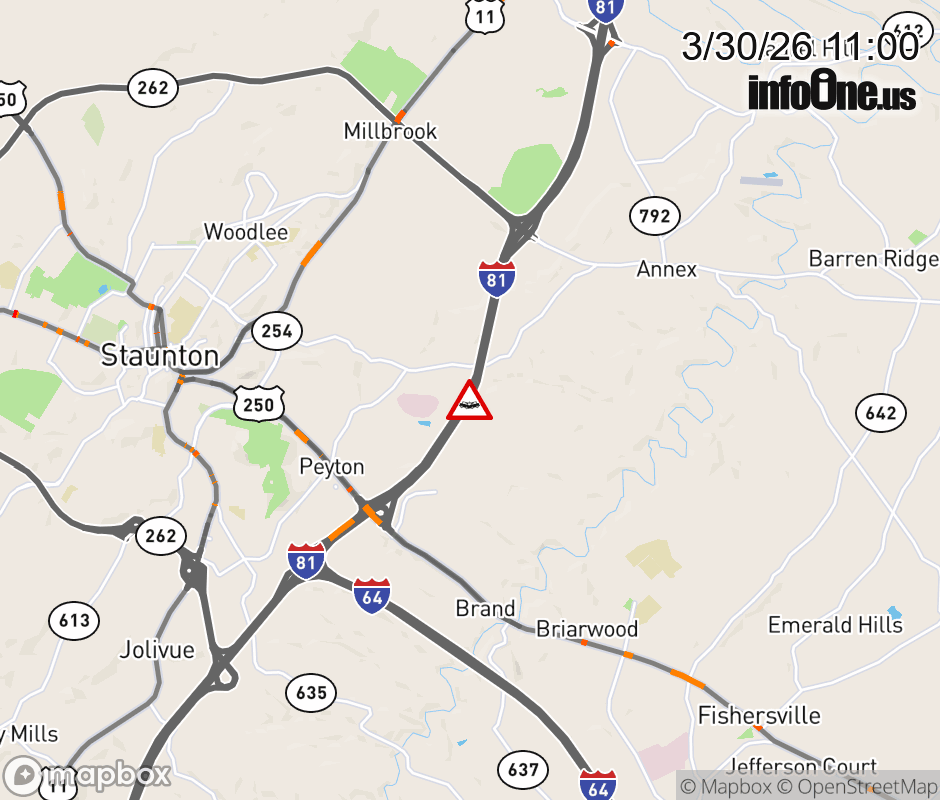 On I-81 at mile marker 224 in the County of Augusta, motorists can expect delays due to a vehicle crash. The north right shoulder is closed. ![]() |
