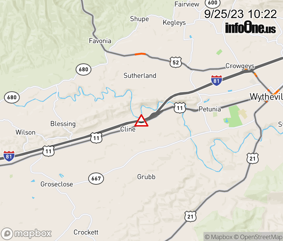 On I-81 at mile marker 67 in the County of Wythe, motorists can expect delays due to a vehicle crash. The north right shoulder is closed. Traffic backups are approximately 1.0 mile.. Updated: Mon 9/25/23 10:22 AM EDT ![]() Updated: Mon 9/25/23 10:22 AM EDT |