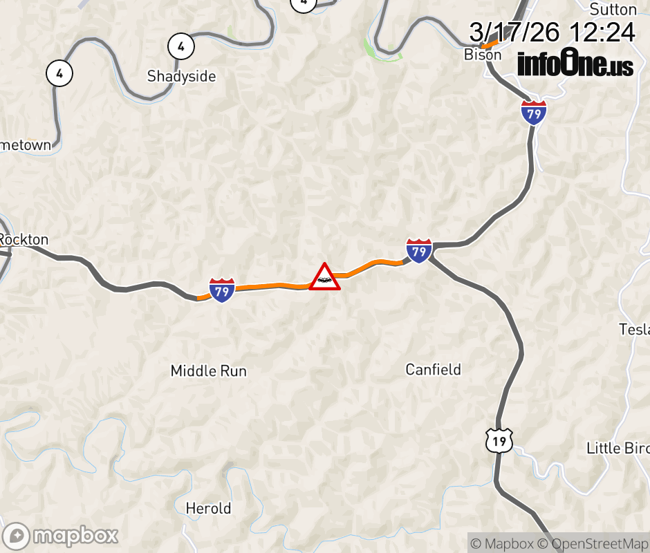 Vehicle Crash on I-79S at Mile Marker 56.0. The southbound road is closed. The northbound left lane is closed. Updated: Tue 3/17/26 12:24 PM EDT ![]() Updated: Tue 3/17/26 12:24 PM EDT |