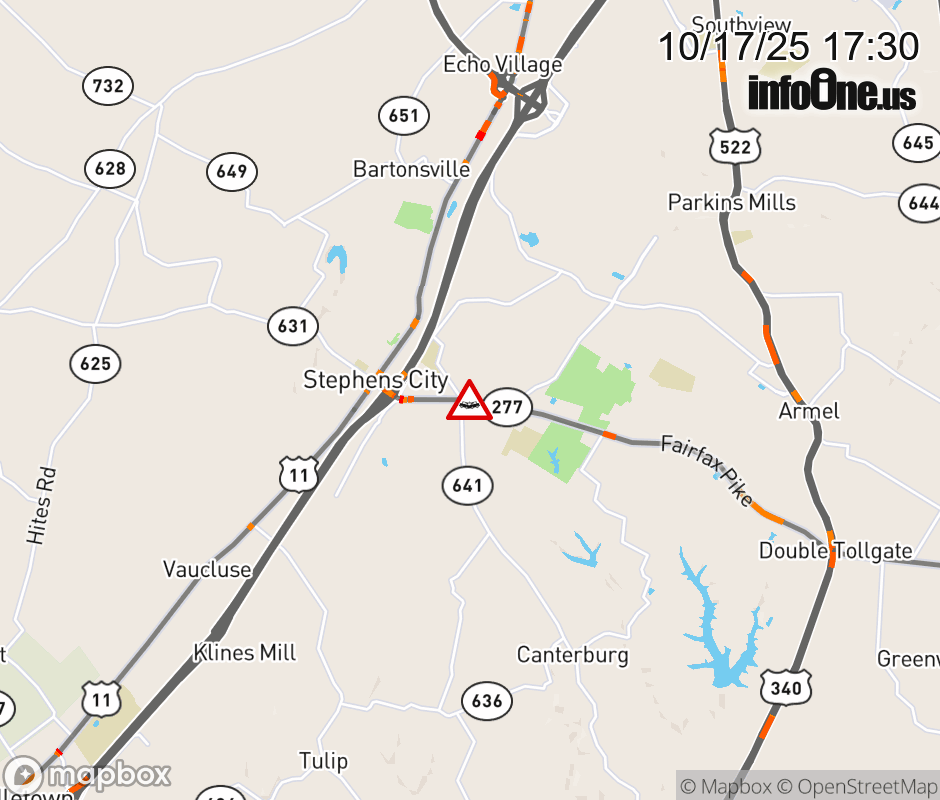 On VA-277 in the County of Frederick, in the vicinity of Nottoway Dr; Rt. 1075N/S (Frederick County), motorists can expect delays due to a vehicle crash. All west lanes are closed. ![]() |