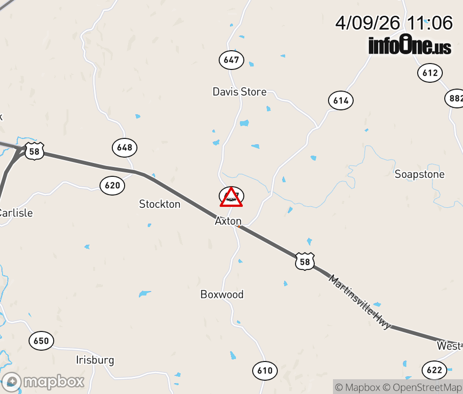 On Rt. 647 in the County of Henry, in the vicinity of Royal Oak Dr; Rt. 1396E/W (Henry County), motorists can expect delays due to a vehicle crash. All north lanes are closed. Updated: Thu 4/9/26 11:06 AM EDT ![]() Updated: Thu 4/9/26 11:06 AM EDT |
