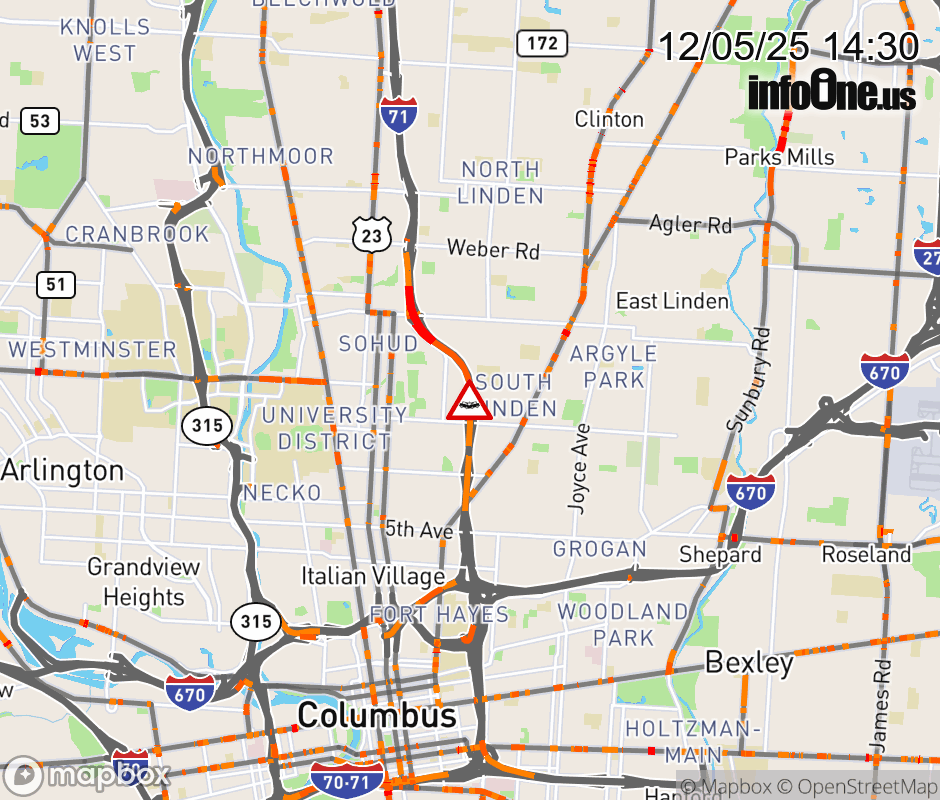 The right lane is blocked on I-71 South at 17th Ave, due to a crash. ![]() |
