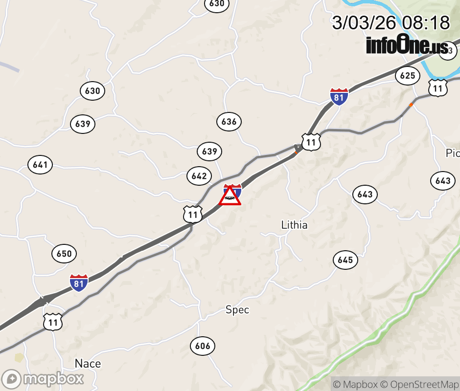 On I-81 South at mile marker 160.5 in the County of Botetourt, motorists can expect delays due to a vehicle crash. Traffic backups are approximately 1.0 mile. Updated: Tue 3/3/26 8:18 AM EST ![]() Updated: Tue 3/3/26 8:18 AM EST |