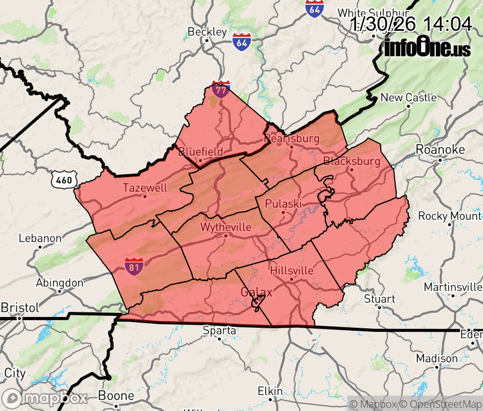 Canceled 1/30/26 8:24 PM Winter Storm Warning issued January 30 at 2:02PM EST until February 1 at 1:00PM EST by NWS Blacksburg VA * WHAT... Heavy snow. Additional snow accumulations between 3 and 6 inches. Winds gusting as high as 50 mph. * WHERE... Portions of southwest Virginia and southeast West Virginia. * WHEN... Until 1 PM EST Sunday. * IMPACTS... Plan on slippery road conditions. The hazardous conditions could impact the Friday evening commute. Gusty winds could bring down tree branches. * ADDITIONAL DETAILS... Strong winds Saturday night into Sunday will result in blowing and drifting snow...reducing visibility at times. ![]() |