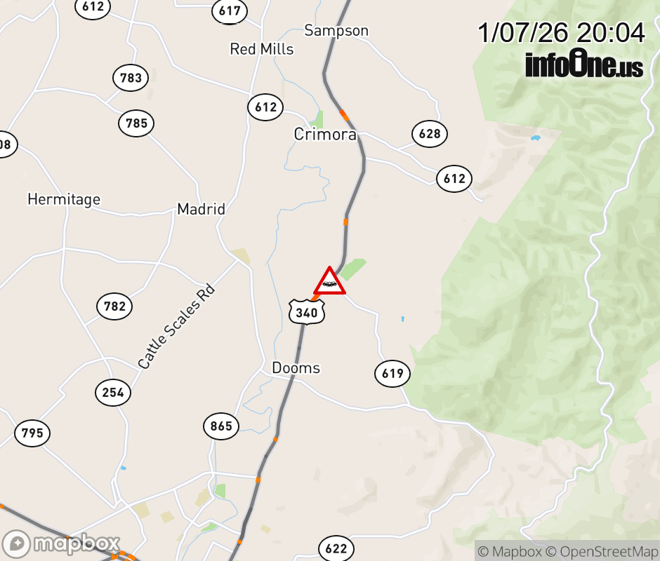 On US-340 in the County of Augusta, in the vicinity of Purple Cow Rd; Rt. 619E/W (Augusta County);PURPLE COW ROAD, motorists can expect delays due to a vehicle crash. All south lanes are closed. ![]() |