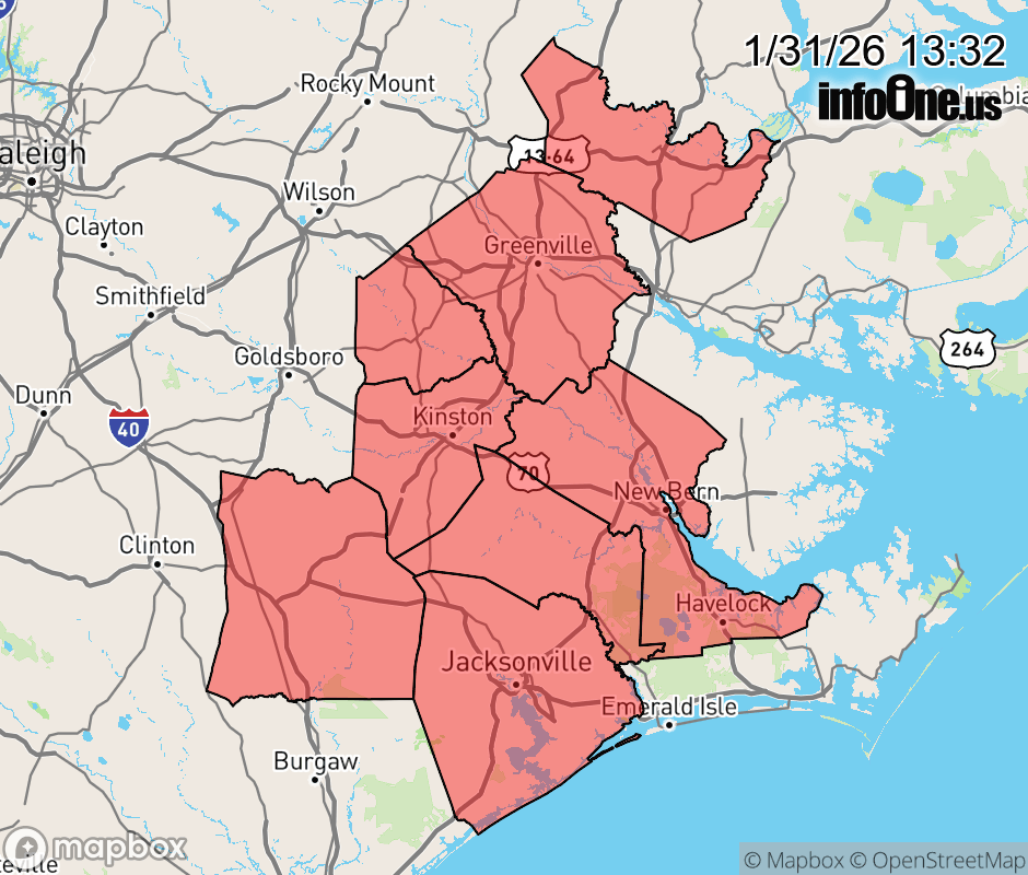Cold Weather Advisory issued January 31 at 1:30PM EST until January 31 at 7:00PM EST by NWS Newport/Morehead City NC * WHAT... For the Cold Weather Advisory, very cold wind chills as low as 6 above. For the Extreme Cold Warning, dangerously cold wind chills as low as 4 below expected. * WHERE... Coastal Onslow, Duplin, Greene, Inland Onslow, Jones, Lenoir, Martin, Northern Craven, and Pitt Counties. * WHEN... For the Cold Weather Advisory, until 7 PM EST this evening. For the Extreme Cold Warning, from 7 PM this evening to 10 AM EST Monday. * IMPACTS... Frostbite and hypothermia will occur if unprotected skin is exposed to these temperatures. ![]() |