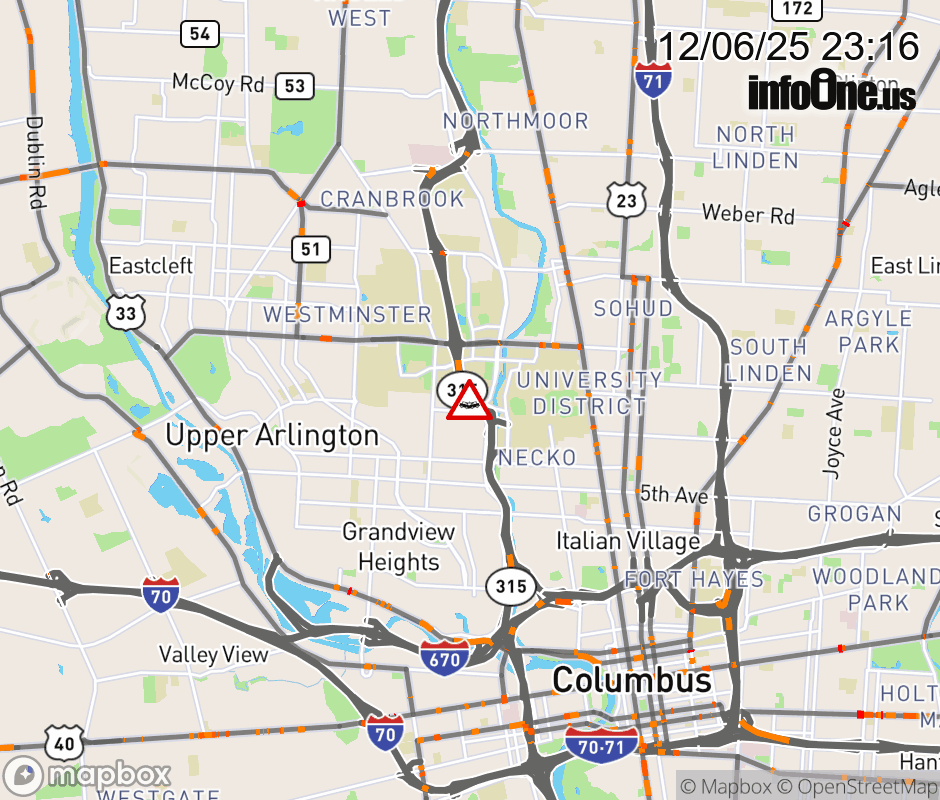 The right lane is blocked on SR-315 North beyond Medical Cntr Dr/King Ave, due to a crash. Updated: Sat 12/6/25 11:16 PM EST ![]() Updated: Sat 12/6/25 11:16 PM EST |