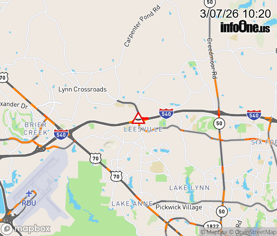 The right shoulder is closed on I-540. Updated: Sat 3/7/26 10:20 AM EST ![]() Updated: Sat 3/7/26 10:20 AM EST |
