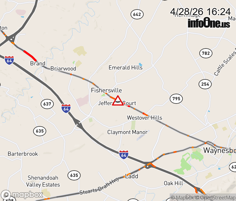 On US-250 in the County of Augusta, in the vicinity of First St; Maple Rd; Rt. 1301N/S (Augusta County), motorists can expect delays due to a vehicle crash. All west lanes are closed. ![]() |