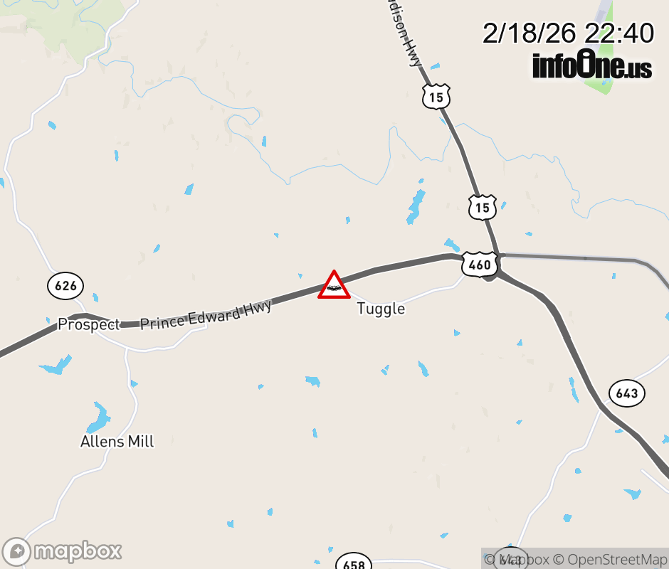 On Rt. 695 in the County of Prince Edward, in the vicinity of Prince Edward Hwy; US-460E, motorists can expect delays due to a vehicle crash. All east lanes are closed. All west lanes are closed. Updated: Wed 2/18/26 10:40 PM EST ![]() Updated: Wed 2/18/26 10:40 PM EST |
