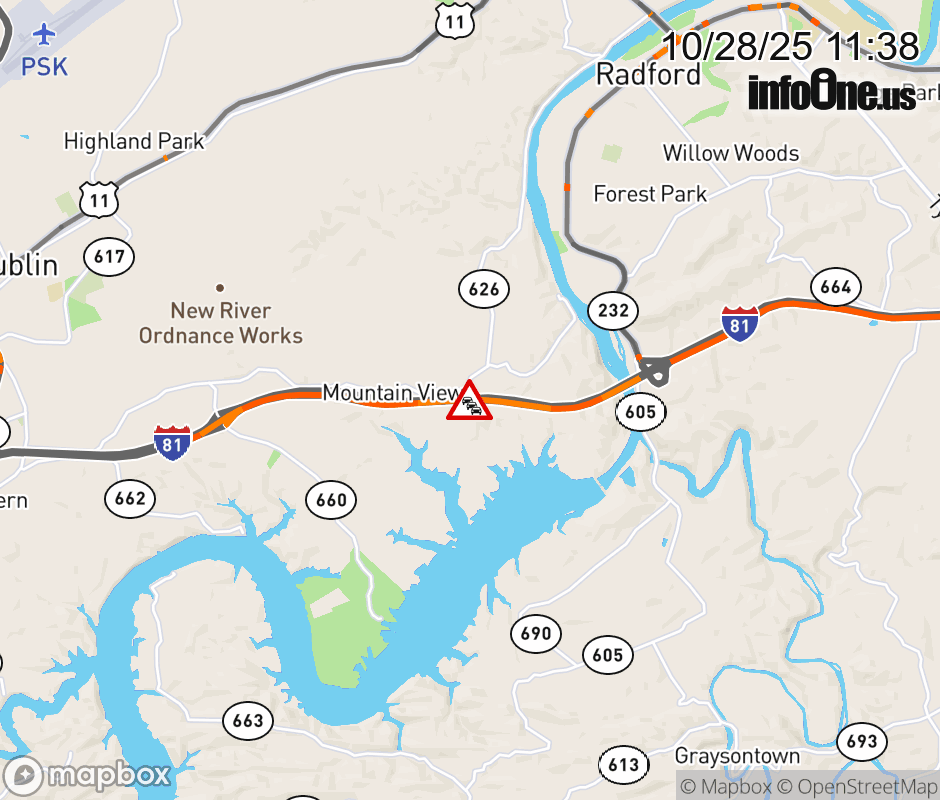 On I-81 North at mile marker 103.5 in the County of Pulaski, motorists can expect delays due to a vehicle fire. Updated: Tue 10/28/25 11:38 AM EDT ![]() Updated: Tue 10/28/25 11:38 AM EDT |