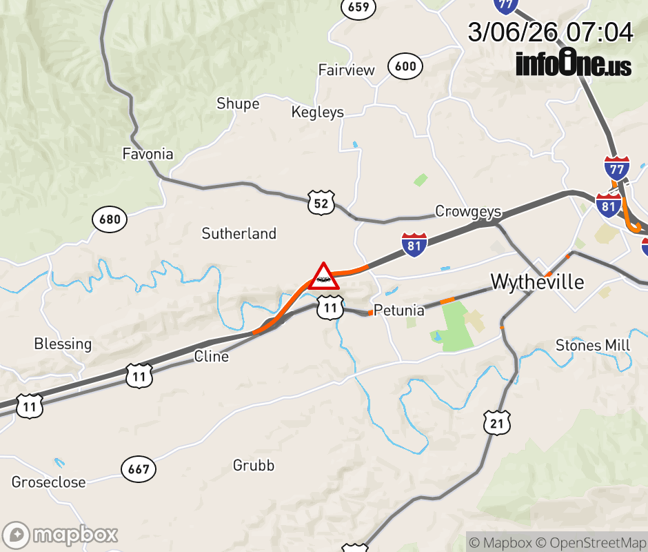 On I-81 at mile marker 68.4 in the County of Wythe, motorists can expect delays due to a tractor trailer crash. The south right lane and right shoulder are closed. Updated: Fri 3/6/26 7:04 AM EST ![]() Updated: Fri 3/6/26 7:04 AM EST |