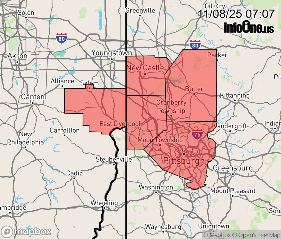 Canceled 11/8/25 8:48 AM Dense Fog Advisory issued November 8 at 7:06AM EST until November 8 at 9:00AM EST by NWS Pittsburgh PA * WHAT... Visibility one to two miles in dense fog. * WHERE... In Ohio, Columbiana County. In Pennsylvania, Beaver, Lawrence, Allegheny, and Butler Counties. * WHEN... Until 9 AM EST this morning. * IMPACTS... Low visibility could make driving conditions hazardous. ![]() |