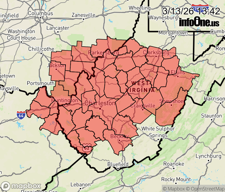 Canceled 3/13/26 7:45 PM Wind Advisory issued March 13 at 1:41PM EDT until March 13 at 8:00PM EDT by NWS Charleston WV * WHAT... Southwest winds 10 to 20 mph with gusts up to 50 mph. * WHERE... Portions of northeast Kentucky, southeast Ohio, and central, northeast, northern, southeast, southern, and western West Virginia. * WHEN... Until 8 PM EDT this evening. * IMPACTS... Gusty winds will blow around unsecured objects. Tree limbs could be blown down and a few power outages may result. ![]() |