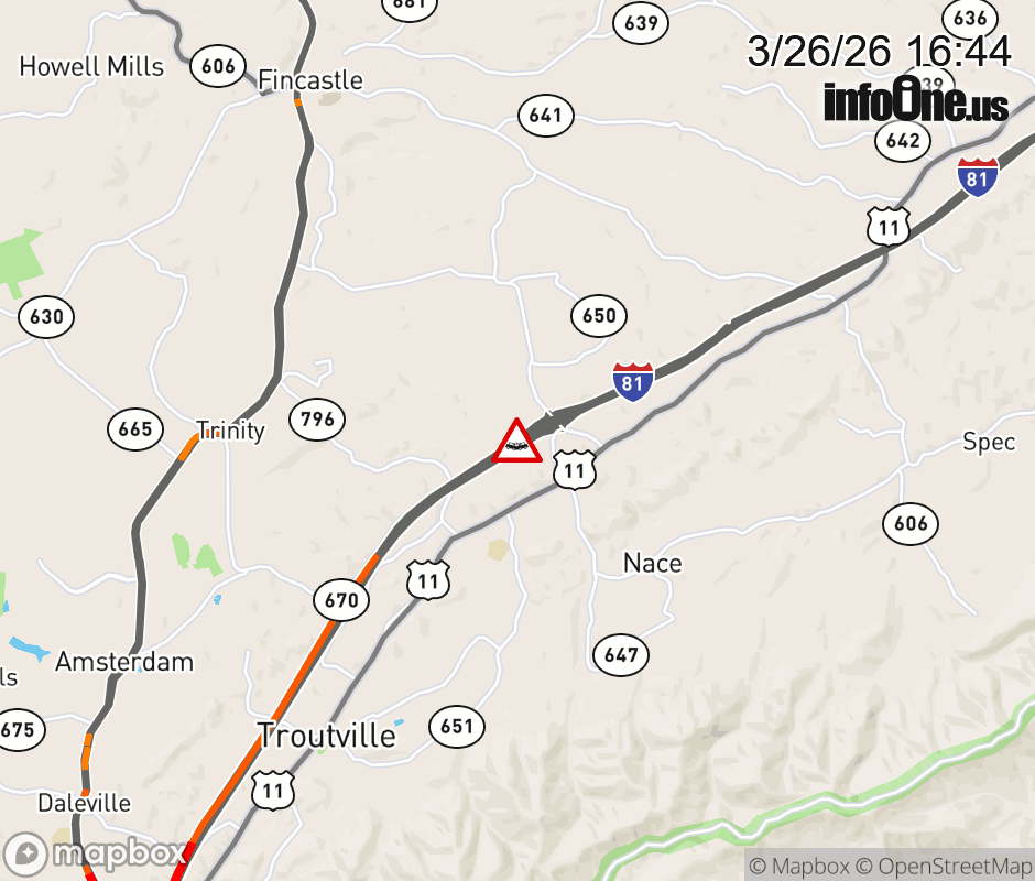 On I-81 at mile marker 156 in the County of Botetourt, motorists can expect delays due to a vehicle crash. The south entrance ramp is closed. The south exit ramp narrows. Updated: Thu 3/26/26 4:44 PM EDT ![]() Updated: Thu 3/26/26 4:44 PM EDT |