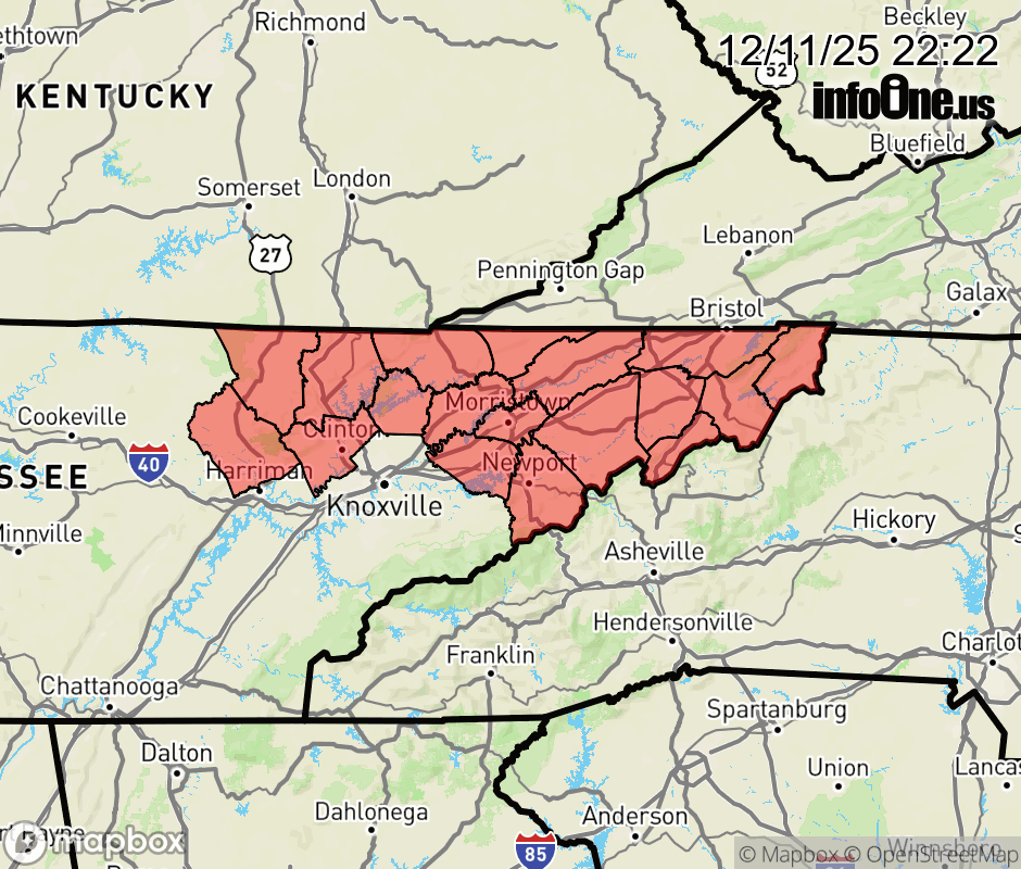 Canceled 12/12/25 6:00 AM Special Weather Statement issued December 11 at 10:20PM EST by NWS Morristown TN Bands of snow will move across the northern Plateau and northeast Tennessee through early Friday morning. The heaviest band may quickly produce 1/2 to 1 inch of snow mainly areas near the Kentucky and Virginia state line. Travel impacts will be possible through early morning especially elevated surface such as bridges and overpasses. Drive with caution and slow down. ![]() |