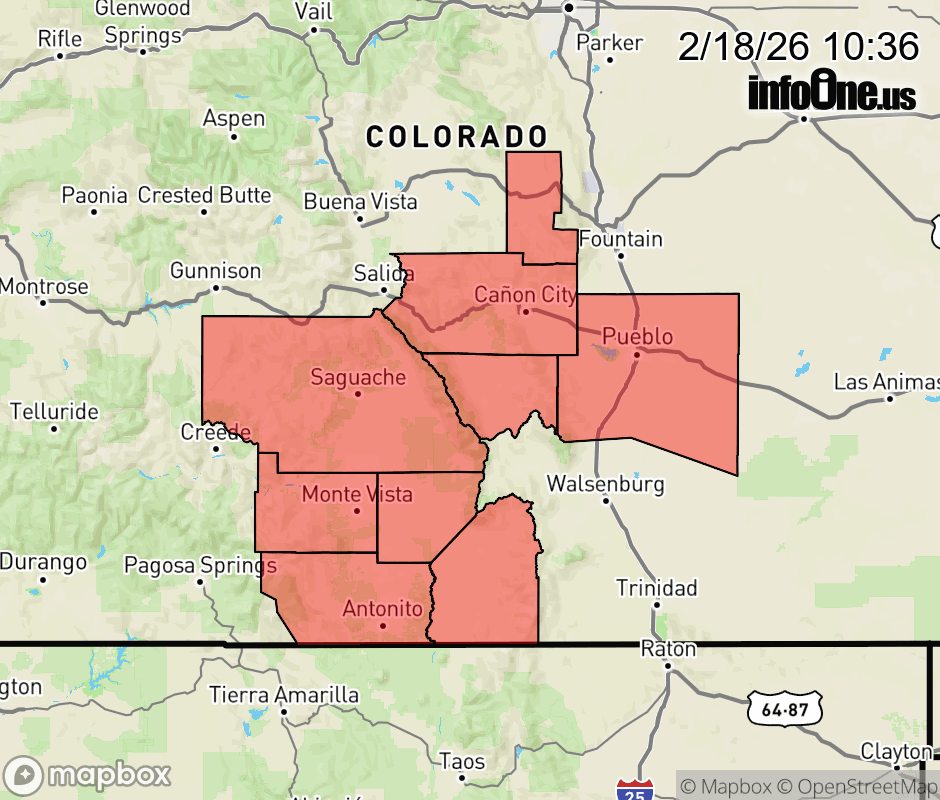Canceled 2/18/26 12:55 PM High Wind Warning issued February 18 at 8:34AM MST until February 18 at 7:00PM MST by NWS Pueblo CO * WHAT... Southwest winds 30 to 40 mph with gusts up to 65 mph. * WHERE... San Luis Valley, Pueblo, Western, Southern and Eastern Fremont County. * WHEN... Until 7 PM MST this evening. * IMPACTS... Damaging winds may blow down trees and power lines. Power outages are possible. Travel will be difficult, especially for high profile vehicles. * ADDITIONAL DETAILS... Areas of blowing dust may reduce visibility to under a mile at times, especially as high based showers roll off the mountains this afternoon. ![]() |