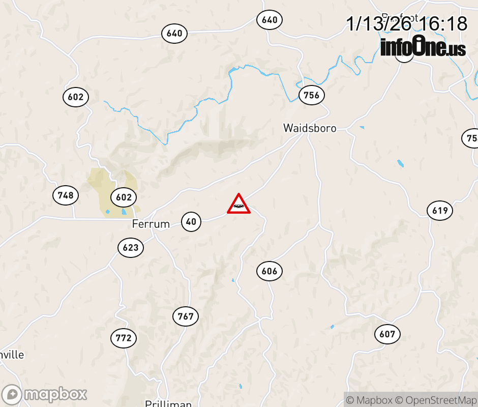 On VA-40 East in the County of Franklin, in the vicinity of Beech Mountain Rd; Rt. 766N/S (Franklin County), motorists can expect delays due to a tractor trailer crash. Lane closures exist. ![]() |