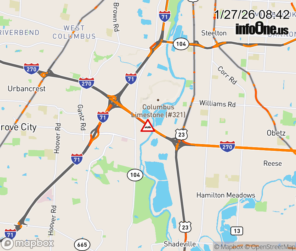 The left lane is blocked on I-270 West beyond US-23/S High St South, due to a disabled vehicle. Updated: Tue 1/27/26 8:42 AM EST ![]() Updated: Tue 1/27/26 8:42 AM EST |