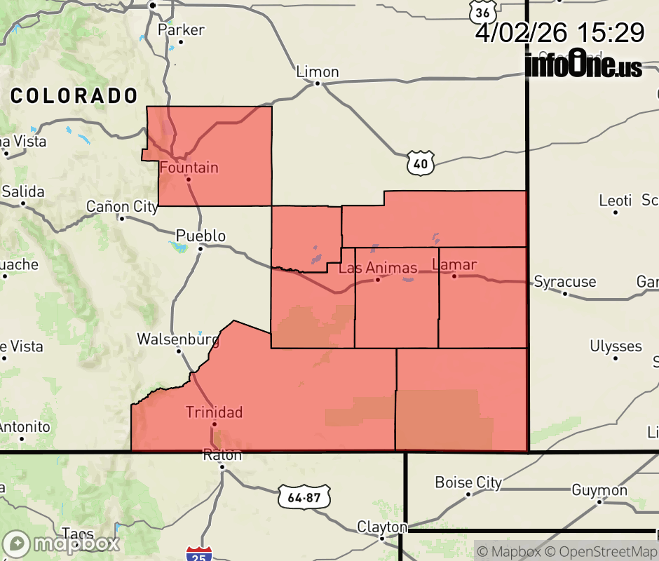 Canceled 4/2/26 4:52 PM Red Flag Warning issued April 2 at 1:27PM MDT until April 2 at 8:00PM MDT by NWS Pueblo CO * AFFECTED AREA... Fire Weather Zones 227, 231, 232, 233, 234, 235, 236 and 237. * WINDS... Southwest 15 to 25 mph with gusts up to 40 mph. * RELATIVE HUMIDITY... As low as 12 percent. * IMPACTS... Fires will catch and spread quickly. Exercise extreme caution and avoid any outdoor burning. ![]() |