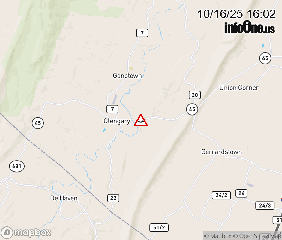 Vehicle Crash on WV-45(Parkinson Rd.). The northbound road is closed. The southbound road is closed. Updated: Thu 10/16/25 4:02 PM EDT ![]() Updated: Thu 10/16/25 4:02 PM EDT |