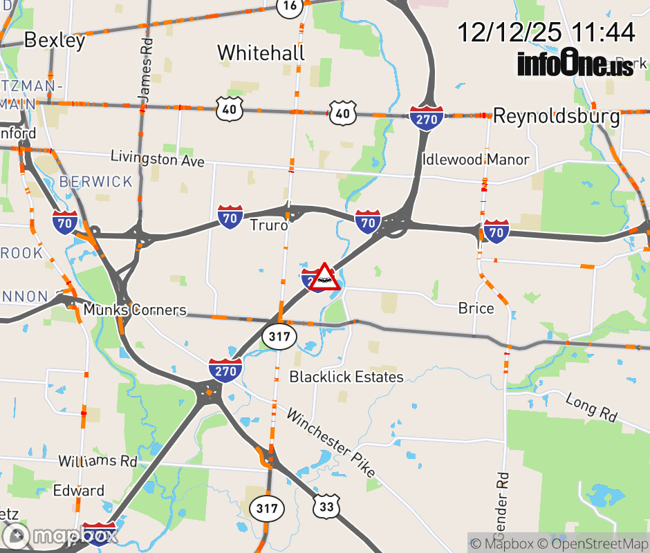 The right lane is blocked on I-270 North beyond US-33, due to a crash. Updated: Fri 12/12/25 11:44 AM EST ![]() Updated: Fri 12/12/25 11:44 AM EST |