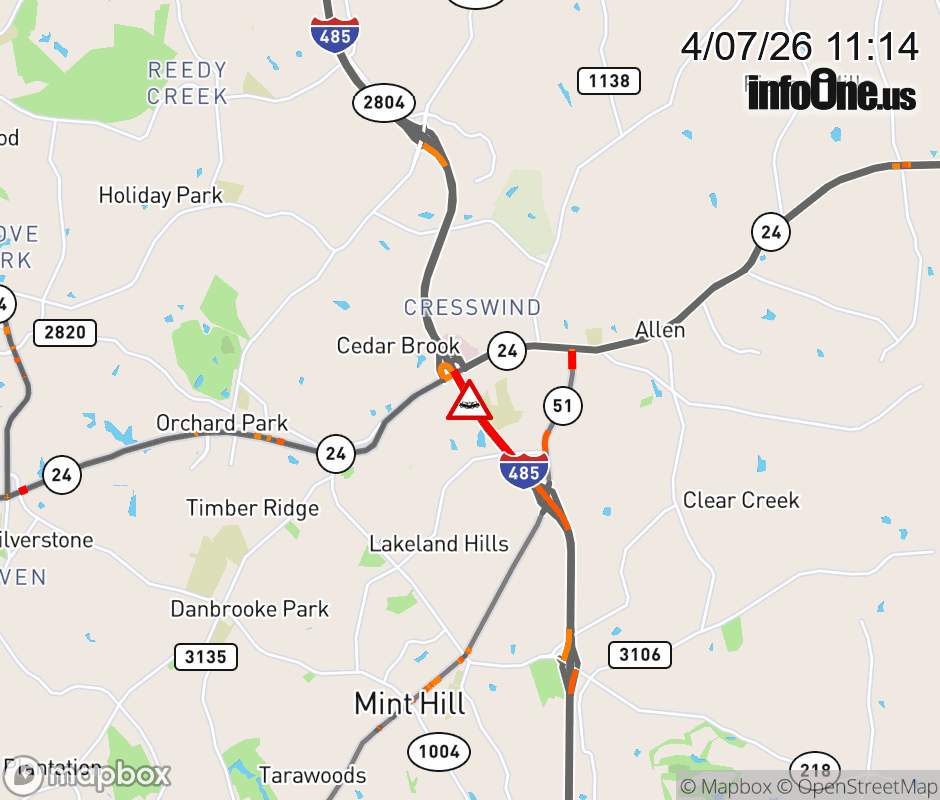 The left lane is closed before Exit 41 (Albemarle Rd.) Updated: Tue 4/7/26 11:14 AM EDT ![]() Updated: Tue 4/7/26 11:14 AM EDT |