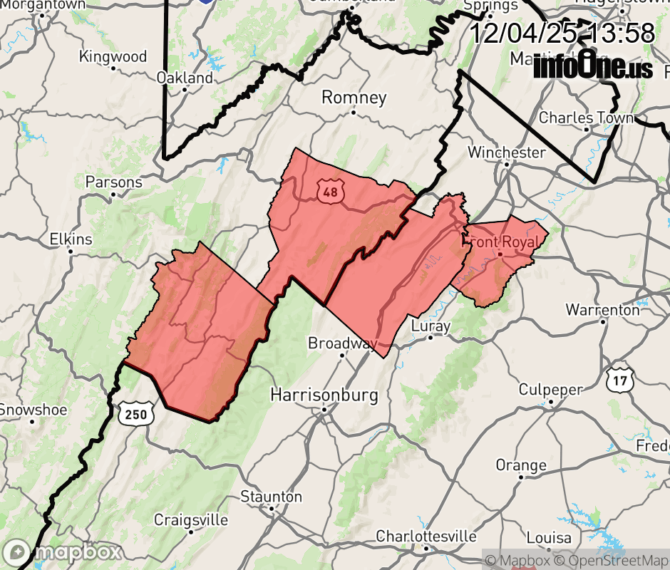 Canceled 12/4/25 9:35 PM Winter Weather Advisory issued December 4 at 1:56PM EST until December 5 at 4:00PM EST by NWS Baltimore MD/Washington DC ...SOME SNOW AND VERY COLD TEMPERATURES WILL RESULT IN TREACHEROUS TRAVEL FOR THE FRIDAY MORNING COMMUTE... .A combination of light snow and very cold temperatures will result in treacherous travel Friday morning. The morning commute will be impacted, with slick and icy roads and sidewalks expected. * WHAT... Snow, with total accumulations of 1 to 3 inches. The highest accumulations will be over the higher terrain in Pendleton County. * WHERE... In Virginia, Shenandoah and Warren Counties. In West Virginia, Eastern Pendleton, Hardy, and Western Pendleton Counties. * WHEN... From 1 AM to 4 PM EST Friday. * IMPACTS... Plan on slippery road conditions. The hazardous conditions will impact the Friday morning commute. * ADDITIONAL DETAILS... Given temperatures will be in the 20s, snow is expected to accumulate on all untreated surfaces. A light snow will overspread the advisory area, with slightly higher amounts possible in any banding features. As snow winds down, a light freezing drizzle is possible into Friday afternoon. ![]() |