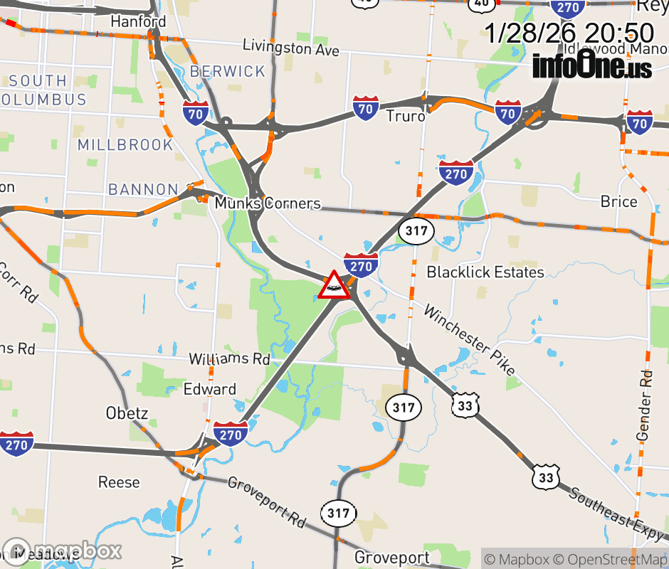 The 2 left lanes are blocked on US-33 East at I-270 South, due to a crash. Updated: Wed 1/28/26 8:50 PM EST ![]() Updated: Wed 1/28/26 8:50 PM EST |
