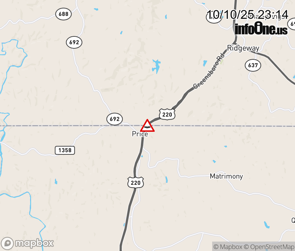 On US-220 in the County of Henry, in the vicinity of Dalton Cir; Greensboro Rd; County/City/Town Line: NORTH CAROLINA ST LINE, motorists can expect delays due to a vehicle crash. The north right lane and right shoulder are closed. ![]() |