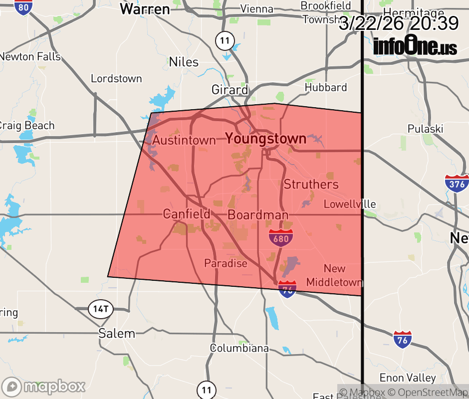 Canceled 3/22/26 9:00 PM Special Weather Statement issued March 22 at 8:38PM EDT by NWS Cleveland OH At 838 PM EDT, Doppler radar was tracking a strong thunderstorm over Canfield, or 7 miles southwest of Youngstown, moving east at 65 mph. HAZARD...Penny size hail. SOURCE...Radar indicated. IMPACT...Minor hail damage to vegetation is possible. Locations impacted include... Youngstown, Boardman, Campbell, Canfield, Maplewood Park, Austintown, Struthers, Girard, Poland, New Middletown, Lowellville, and Mineral Ridge. ![]() |