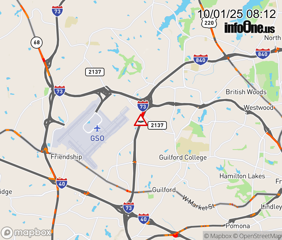 The center lane is closed near Exit 104 (W Friendly Ave).