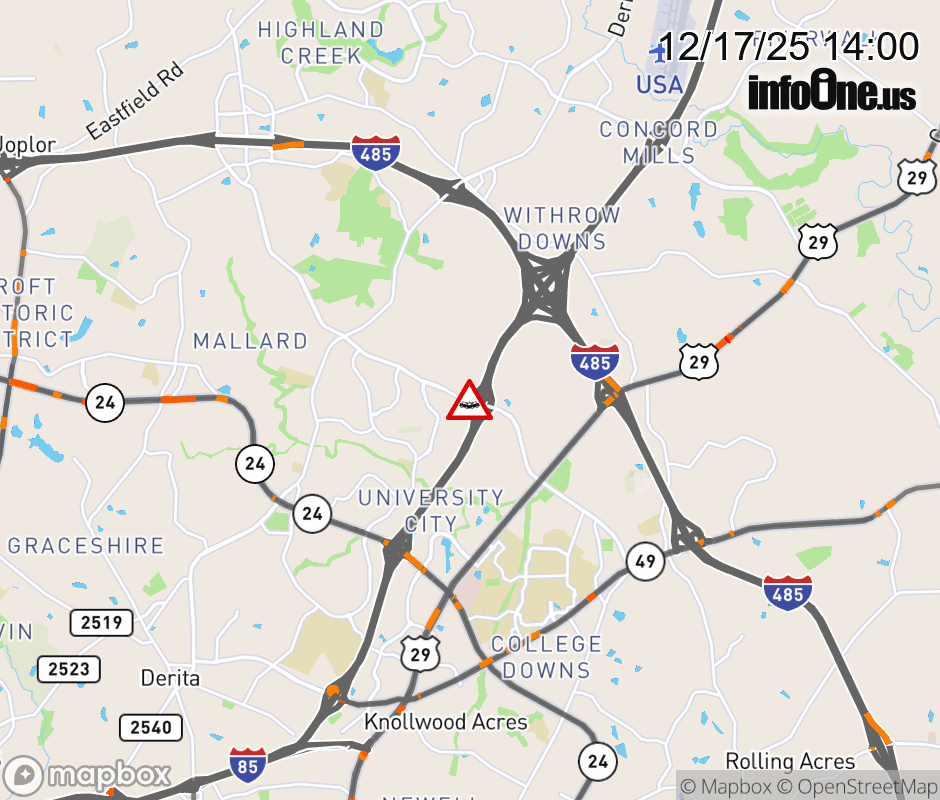 The right lane is closed on the ramp from I-85 South to W Mallard Creek Church Rd. ![]() |