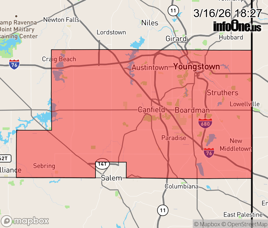 Canceled 3/16/26 11:46 PM Winter Weather Advisory issued March 16 at 6:26PM EDT until March 17 at 12:00AM EDT by NWS Cleveland OH * WHAT... Snow. Additional snow accumulations one to three inches. Winds gusting as high as 35 mph. * WHERE... Mahoning County. * WHEN... Until midnight EDT tonight. * IMPACTS... Plan on slippery road conditions. The hazardous conditions could impact the Monday evening commute. ![]() |