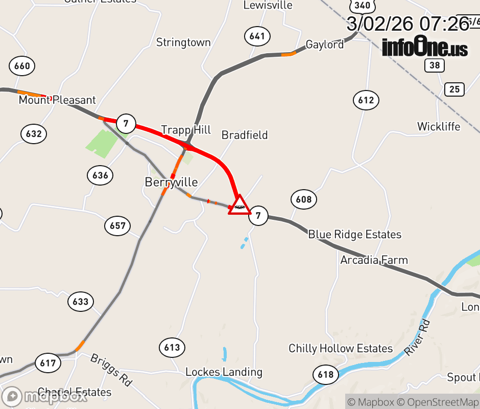 On VA-7 in the County of Clarke, in the vicinity of E Main St; Xovr; BUS VA-7E/W, motorists can expect delays due to a multi-vehicle crash. The east left shoulder and left lane are closed. ![]() |