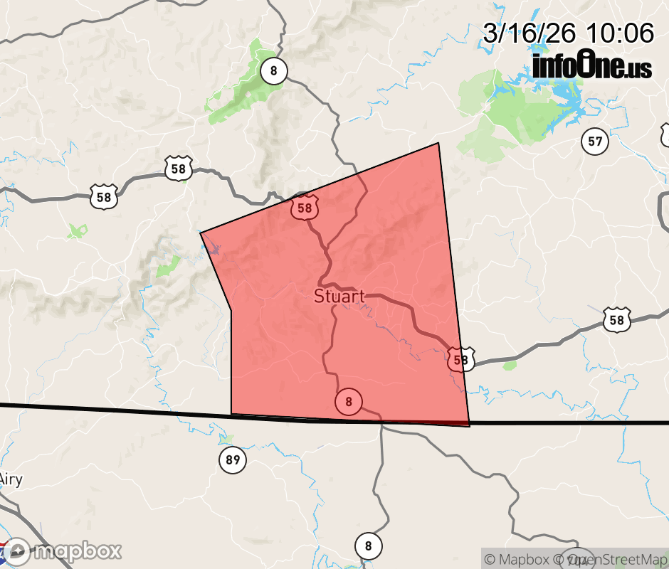 Canceled 3/16/26 10:30 AM Tornado Warning issued March 16 at 10:05AM EDT until March 16 at 10:30AM EDT by NWS Blacksburg VA At 1004 AM EDT, a severe thunderstorm capable of producing a tornado was located over Stuart, moving east at 60 mph. HAZARD...Tornado. SOURCE...Radar indicated rotation. IMPACT...Flying debris will be dangerous to those caught without shelter. Mobile homes will be damaged or destroyed. Damage to roofs, windows, and vehicles will occur. Tree damage is likely. Locations impacted include... Stuart... Patrick Springs... and Critz. ![]() |