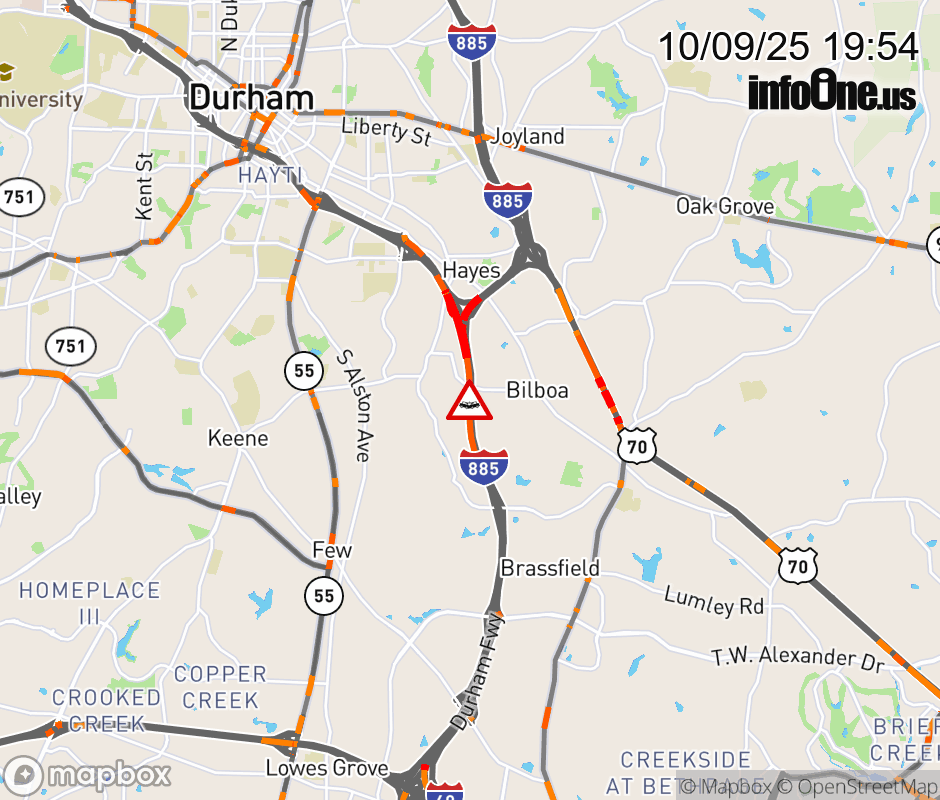 The right lane is closed near Exit 9 (NC 147). Updated: Thu 10/9/25 7:54 PM EDT ![]() Updated: Thu 10/9/25 7:54 PM EDT |