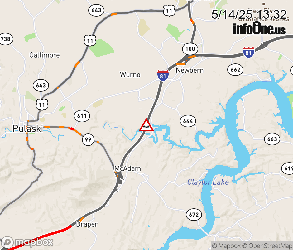On I-81 at mile marker 96.2 in the County of Pulaski, motorists can expect delays due to a multi-vehicle crash. The north right shoulder is closed. Traffic backups are approximately 2.5 miles. Updated: Wed 5/14/25 1:32 PM EDT ![]() Updated: Wed 5/14/25 1:32 PM EDT |
