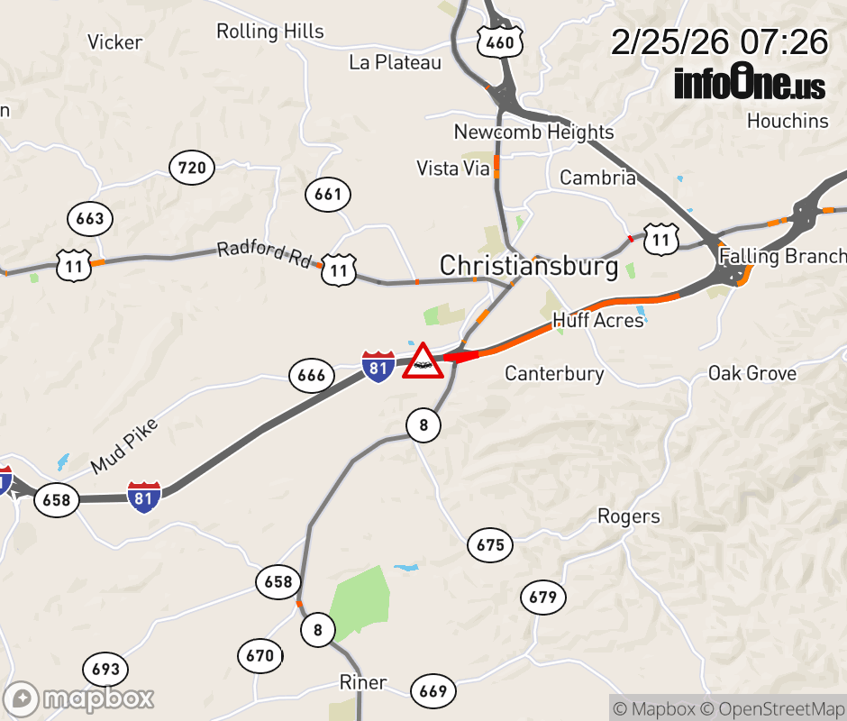 On I-81 at mile marker 114 in the County of Montgomery, motorists can expect delays due to a vehicle crash. The north right shoulder is closed. Updated: Wed 2/25/26 7:26 AM EST ![]() Updated: Wed 2/25/26 7:26 AM EST |