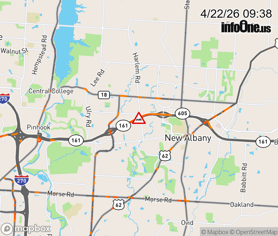 The right shoulder is blocked on SR-161 West beyond New Albany Rd, due to a disabled vehicle. Updated: Wed 4/22/26 9:38 AM EDT ![]() Updated: Wed 4/22/26 9:38 AM EDT |
