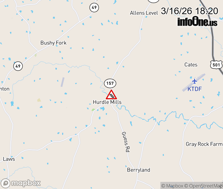 The road is closed near Hurdle Mills Rd. Updated: Mon 3/16/26 6:20 PM EDT ![]() Updated: Mon 3/16/26 6:20 PM EDT |