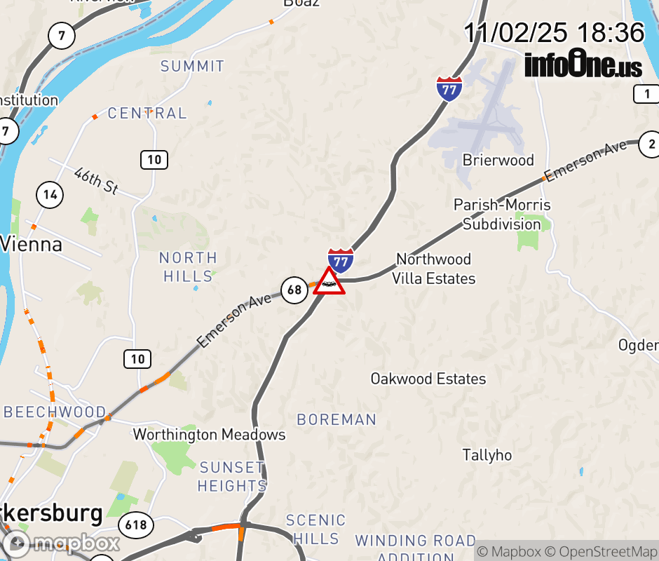 Vehicle Crash on WV-68 (Emerson Ave) & I-77 South Ramps (MM 179) in Parkersburg. ![]() |