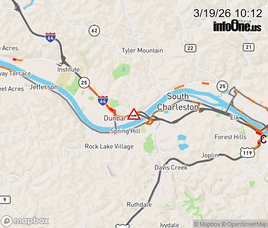 Disabled Vehicle on I-64W at Mile Marker 53.0. Comments:On the Dunbar entrance ramp. Updated: Thu 3/19/26 10:12 AM EDT ![]() Updated: Thu 3/19/26 10:12 AM EDT |