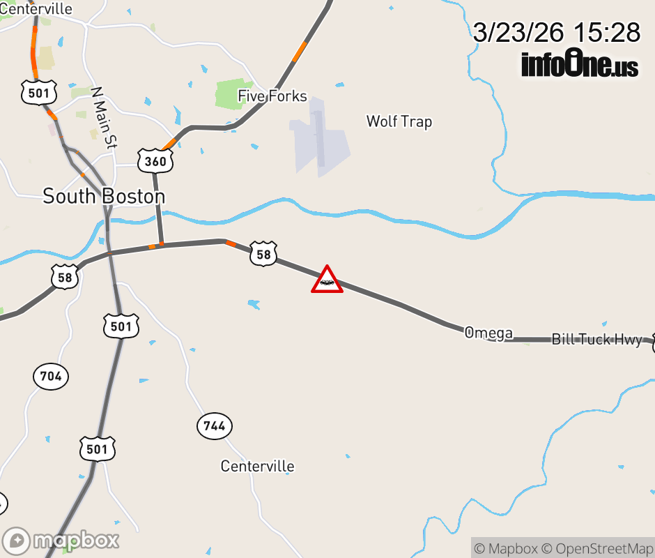 On US-58 East in the County of Halifax, in the vicinity of Alphonse Dairy Rd; Rt. 742E/W (Halifax County), motorists can expect delays due to a vehicle crash. Lane closures exist. ![]() |