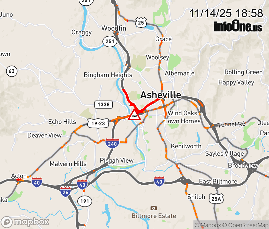 The left lane is closed before Exit 3A, Patton Avenue. Updated: Fri 11/14/25 6:58 PM EST ![]() Updated: Fri 11/14/25 6:58 PM EST |