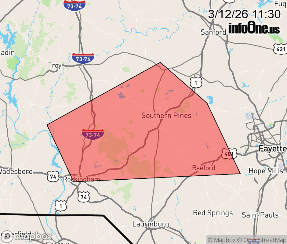Canceled 3/12/26 12:15 PM Special Weather Statement issued March 12 at 11:29AM EDT by NWS Raleigh NC At 1129 AM EDT, Doppler radar was tracking a strong thunderstorm near Hoffman, or 9 miles southwest of Southern Pines, moving northeast at 50 mph. HAZARD...Wind gusts of 50 to 55 mph. SOURCE...Radar indicated. IMPACT...Gusty winds could knock down tree limbs and blow around unsecured objects. Locations impacted include... Southern Pines, Rockingham, Raeford, Carthage, Pinehurst, Aberdeen, Hoffman, Whispering Pines, Pinebluff and Ellerbe. This includes Interstate 73 between Mile Markers 26 and 39. ![]() |
